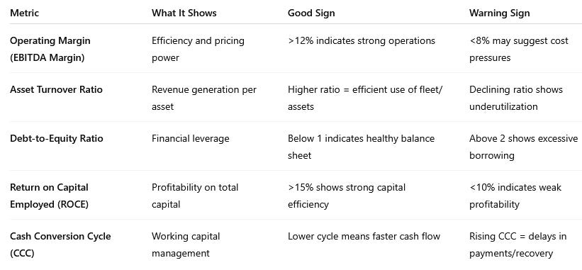 These ratios together reveal whether a logistics company runs efficiently, manages cash well, and maintains a sustainable capital structure.